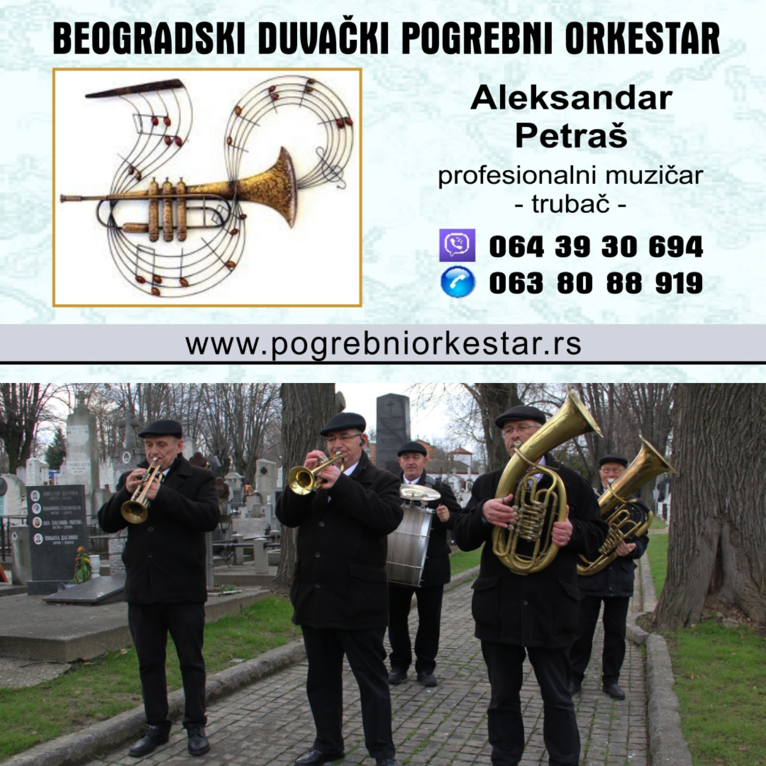 Muzika za sahrane.Trubači za pogrebe.Orkestar za sahrane, Beogradski duvački pogrebni orkestar,sastavljen od profesionalnih školovanih muzičara.Dugi niz godina krajnje profesionalno obavljamo ovu delatnost na sahranama,opelima, kremacijama,polaganjima urne,pomenima, ispraćajima.Nastupamo kao orkestar ali i pojedinačno, (truba, violina, crkveni hor ) zavisno od želje klijenata.U repertoaru koji sviramo nalaze se pogrebni marševi, starogradske pesme,romanse,romske pesme,sevdalinke,klasična muzika. "Muzika i veselje dočekuju čoveka pri rodjenju, pesma ga prati kroz život i na kraju ona je opet tu da ga poslednja isprati"