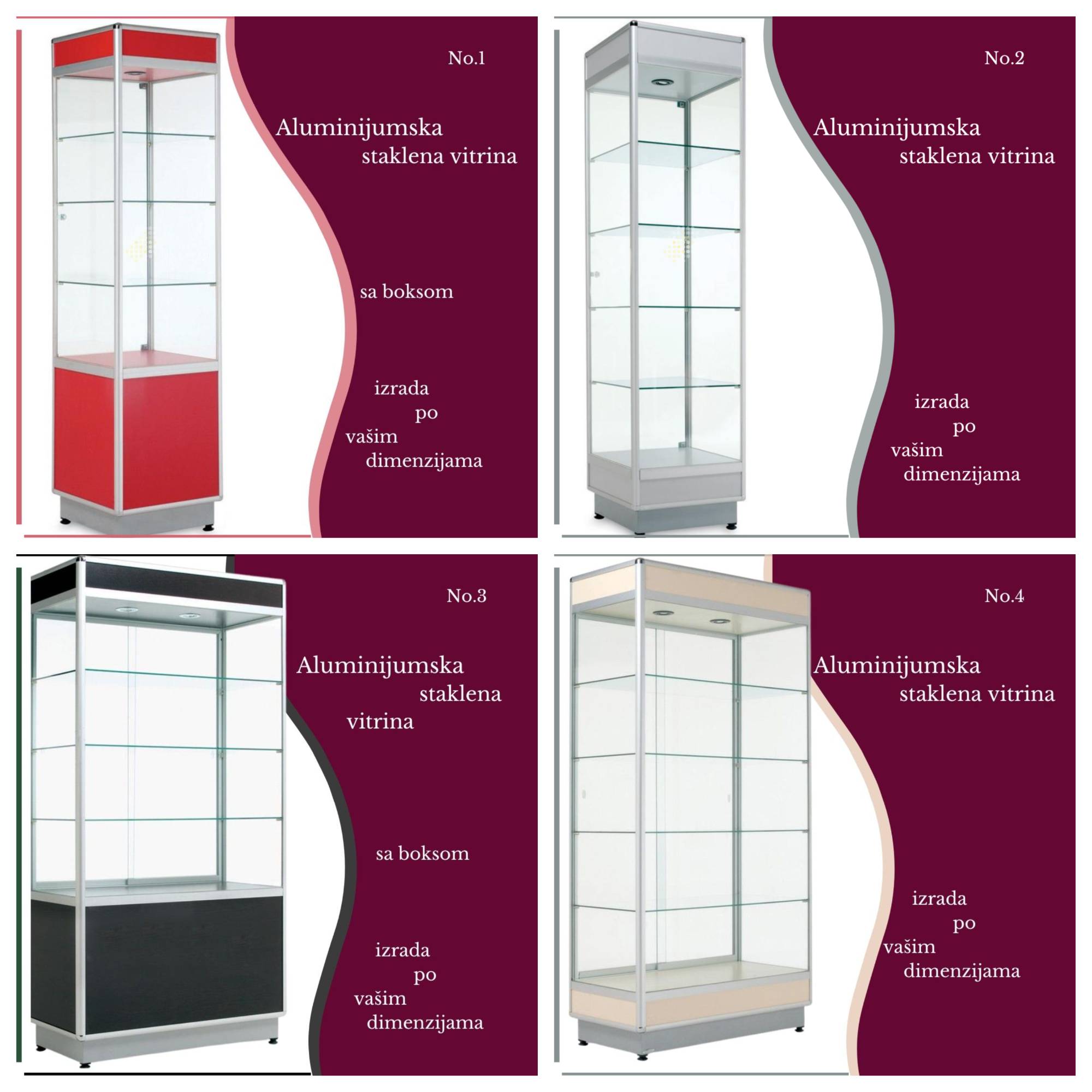 Vitrine se izrađuju sa običnim ili kaljenim staklom. Sa bravom ili bez. Sa osvetljenjem ili bez. Sa spremištem ili bez.