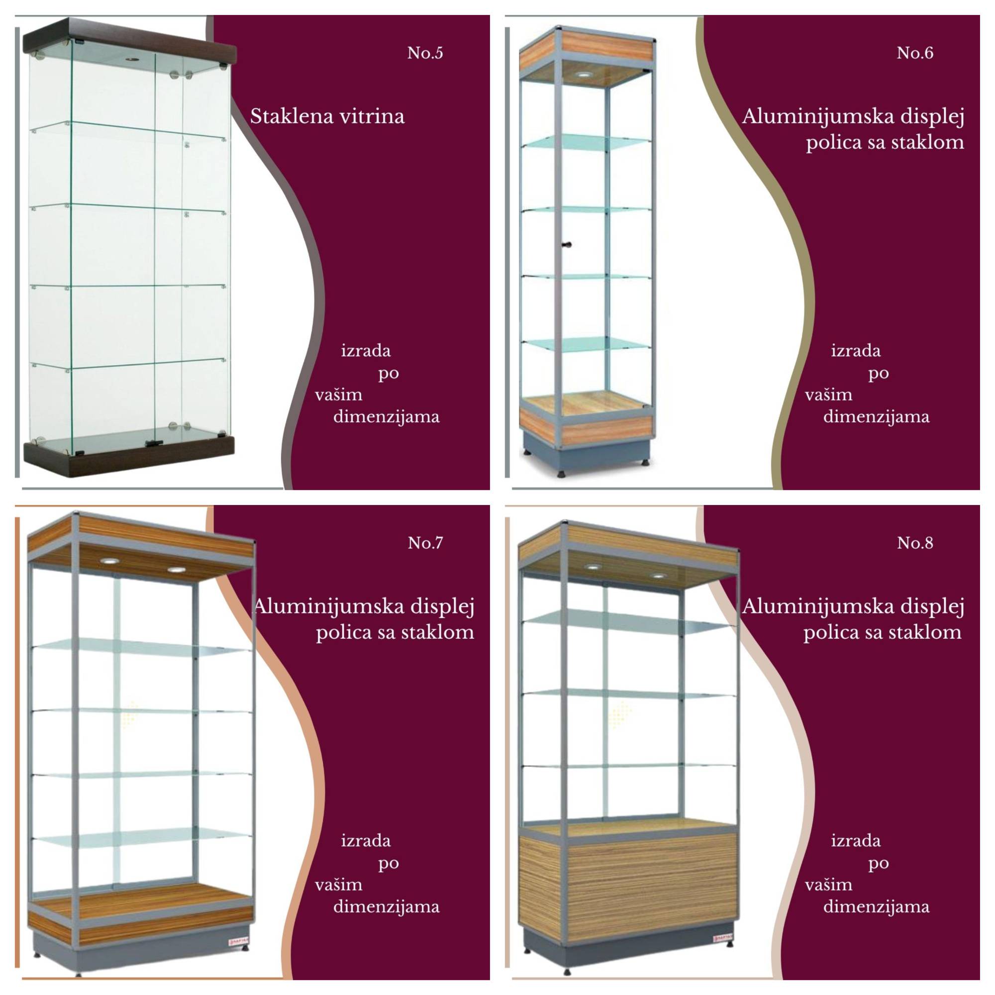 Proizvodimo vitrine po već uređenim dimenzijama, standardnim dimenzijama, a svakako ih možemo uraditi i na osnovu vašeg nacrta ili prilagođeno potrebi vaše delatnosti i vašeg prostora.