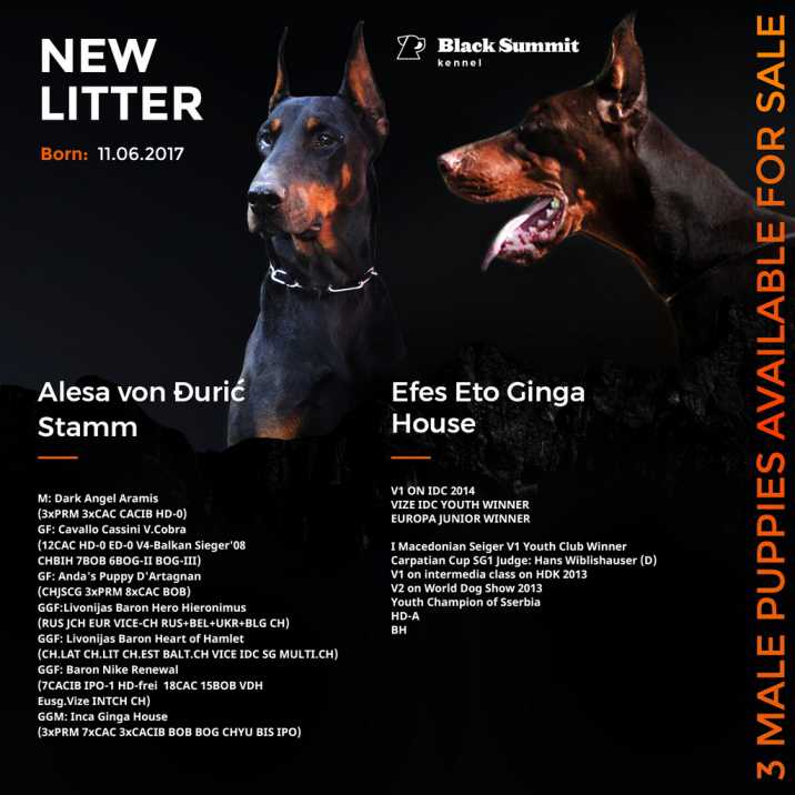 Na prodaju stenci dobermana ostenjeni 11.06.2017. Stenci su sampionskih krvnih linija, strucno odnegovani, vakcinisani, revakcinisani i ocisceni od parazita. Izlozbenog karaktera i sampionskog porekla kako sa oceve tako i sa majcine strane. Preostala su tri muska steneta. Odgajivacnica Black Summit Kennel - Jagodina.